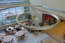 Pavillon B, located at 1111 Notre-Dame Street West contains Coop ÉTS, Tim Hortons, Le 100 Génies Resto-pub, IT service counter, Daycare Centre, General education department, and Sports centre.