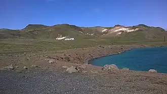 There were farms in the vicinity from the Middle Ages till 1945.[2] After the eruption known as the Krýsuvík fires in the middle of the 12th century, probably in 1151-1188, the main farm was transferred to a place under the mountain Bæjarfell. The name Krýsuvík was still used for the farm, though the buildings were at a distance of some kilometers from the sea.[2] The farm had a reputation for being very rich till the end of the 19th century. Being near the sea, the farm had additional income from fishing and hunting. Commerce was also done, because the farm was a junction of old trails from the north to the south coast.[2] Also the sulfur of the nearby geothermal areas was mined and exported.[3] However, Krýsuvík was too far away from upcoming industry and commerce and therefore abandoned in the middle of the 20th century.[2]
