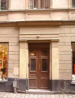 On either side of Number 37 are Lilla Hoparegränd ("Smaller Heaper's Alley", a corruption of "Hoper's Alley", e.g. hooper indicating a profession, 'maker of barrels') and Pelikansgränd ("Pelican's Alley"), both forking off from Gaffelgränd ("Fork alley"). While the building is standing on a medieval wall, the façade is from the 18th century, and the portal from the 17th century. The latter was probably cut by Johan Wendelstam, a German sculptor who arrived to Stockholm in 1641 to become the Guild Master within a few years, and also cut one of the portals on Stortorget. The client was apparently Dutch as the inscription on the gable stone reads: Gaet het wel men heeft veel vrinden kert het luck wie kan se vinden ("When luck stands by one have a lot of friends, but when luck turns where are they then?"). Behind the front door is an entrance hall featuring a richly profiled sandstone column carrying a cross-vault.[5][26] The façade of Number 24 dates back to 1862, the shutters and wooden panels from that time however replaced by the rough-cast plaster probably in 1945, and the windows enlarged since.[27] The rusticated façade of Number 26 dates back to the enlargement in 1846, at the time it was however perfectly symmetric, a balance manipulated in 1973 when the enlarged opening and wooden panel of the restaurant entrance was added. The northern door, still featuring some original details, gives a fair impression of what the façade looked like in the 19th century.[28] The façade of Number 28, arguably one of the oldest still existent residential properties in Stockholm, is mostly from 1874 with some details replaced in 1969.[29]