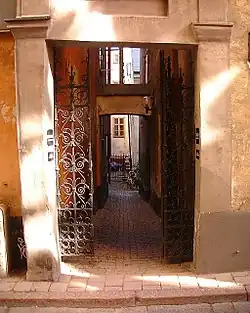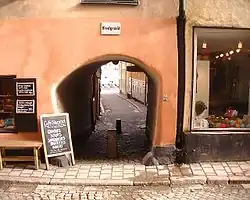 The alley Kråkgränd, named after the magistrate Knut Nilsson Kråka who lived there in the early 17th century. The alley have also been named after the magistrate Johan Persson who in 1638 took over a property said to be located "on the upper corner in a vault over the alley".[9] Under the first five small building behind Number 15 are the merged medieval cellars of the restaurant Fem Små Hus ("Five Small Houses") started in 1969. The basement of the block have, however, served as a tavern for several hundreds years – two illegal inns were reported in 1694.[10][11]