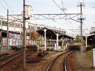 The station has an island platform and a side platform connected to the station building by a level crossing. The station building has both a staffed service counter and automatic ticket machines.