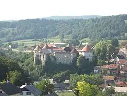 Between 1526 and 1533, the prince bishop Christophorus Rauber fortified the castle and added seven defence towers or bastilles.[2] As a result of its new strength, the brothers Jurij and Wolf Auersperg from Turjak bought the castle in 1538, and for centuries the castle and town were in the possession of the leading noble Auersperg family.[3][4] One of its most esteemed owners was Johann Weikhard of Auersperg, the tutor of the emperor Ferdinand III, who was court councillor and the first minister in the Habsburg monarchy, and who obtained family rights to prevent the castle's sale.[4] In the 16th century the town suffered repeated attacks. In 1559, the castle was conquered by Gregor, an illegitimate son of Georg von Auersperg with eighteen soldiers, but this conquest was quickly suppressed, and the castle was recaptured by Herbard VIII von Auersperg, the general of the Croatian region of the time, and the dead soldiers were thrown into the forest to be devoured by wild beasts.[2] In 1575, Countess Ana von Eck from Brdo Castle was killed by a tame bear in the castle courtyard.[4]