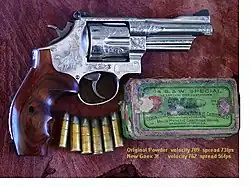 Smith & Wesson wished to pair their new revolver design with a worthy new ammunition chambering.[5] At the time, smokeless powder was state of the art in ammunition technology. Older black-powder ammunition was in the process of being converted to smokeless. Smith & Wesson's popular .44 Russian cartridge had established a reputation for superb accuracy and was a renowned target load, and they decided to use an improved smokeless powder version as the basis for the new round. Due to the lower energy density of the early semi-smokeless powders, prior efforts to convert the .44 Russian to smokeless had produced less than stellar ballistic performance. Smith & Wesson addressed this issue by lengthening the .44 Russian cartridge case by 0.190-inch (4.8 mm) and increasing the powder capacity by 6 grains (0.39 g).[6] The resulting design, which S&W called the .44 Special, had a case length of 1.16-inch (29 mm).[5]