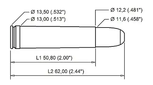 The .458×2-inch American is a belted, straight, .458 caliber (11.6 mm) big-bore cartridge designed by Frank Barnes. It is based on the .458 Winchester Magnum shortened to 2 in (51 mm).[1]