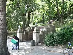 From the southern end of the station, there is a staircase on the west side of St. Nicholas Avenue at West 135th Street to the southbound platform, within St. Nicholas Park, a staircase from the northeastern corner of St. Nicholas Avenue and West 135th Street to the northbound platform, and two staircases to the northbound platform from the southeastern corner of St. Nicholas Avenue and West 135th Street. At the northern end of the station, there is a staircase leading to the southbound platform from the western side of St. Nicholas Avenue at West 137th Street, within St. Nicholas Park, and an exit-only staircase from the northbound platform leading to the southeastern corner of St. Nicholas Avenue and West 137th Street.[9] This exit features an array of stone casting in a Cathedral-like setting, originally built in 1932.