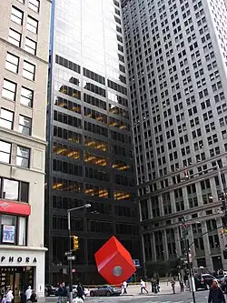 Noguchi's final sculpture, titled The Cube, was installed in 1968. It is a vermilion-hued rhombohedron with a cylindrical hole through its center, standing upon one corner and measuring 28 feet (8.5 m) tall.[6][49][50] The Cube is located off-center, on the north side of the plaza, contrasting with 140 Broadway's dark facade while turning viewers' attention toward the surrounding plaza.[51] Like 140 Broadway, it was detailed by SOM and has an aluminum frame.[52] Bunshaft praised The Cube as "work[ing] beautifully with the building [in] every way",[53] while Metropolitan Museum of Art director Thomas Hoving said that the cube was a sign of "change in public taste".[54]