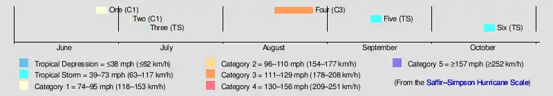 | 6 systems | June 25 – October 19 | 115 (185) | 960 | $60,000 | 23 (1) | |||||