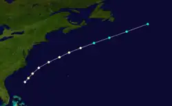 This storm was first observed by the brig Hattie Eaton on July 16, while located a few hundred miles offshore the Carolinas. The Hattie Eaton reported sustained winds of 80 mph (130 km/h) – equivalent to a Category 1 hurricane on the modern day Saffir–Simpson hurricane wind scale.[2] Early on July 18, the hurricane weakened to a tropical storm. Several hours later, the storm was last noted by ship Energy, while located about 435 mi (700 km) east of Cape Race, Newfoundland.[2][4]