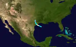 The first cyclone of the season existed by 00:00 UTC on June 16 in the northwestern Gulf of Mexico, based on Brownsville, Texas, recording sustained winds of 28 mph (45 km/h).[7] Due to sparse observations, the system may have developed prior to this time, but was not detected. Centered about 200 mi (320 km) southeast of Galveston Island on July 16, the cyclone moved west-northwestward and quickly strengthened, becoming a hurricane several hours later. It peaked with sustained winds of 80 mph (130 km/h) early on June 17, and made landfall southwest of Bay City, Texas, over the eastern end of East Matagorda Bay around 06:00 UTC. Turning to the northwest after landfall, it quickly degenerated into a tropical storm, gradually turning northward over time. The cyclone weakened into a tropical depression around 06:00 UTC, and lost its identity just 12 hours later near Waco.[5] Climate researcher Michael Chenoweth proposed that this storm approached Texas on a north-northwestward course and made landfall as a tropical storm, without ever attaining hurricane status.[4]