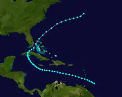 Fernández-Partagás and Diaz expressed "some skepticism about the exist of the storm" prior to October 7, but nonetheless accepted previous versions of the track of this storm showing development just east of the Windward Islands on October 2.[4] The tropical storm moved west-northwestward and passed near or over Bequia, an island of the modern-day Saint Vincent and the Grenadines, while entering the Caribbean on the next day.[3] Continuing west-northwestward to northwestward for several days, the cyclone passed just west of Jamaica on October 8 and then turned in a more northerly direction on October 9. By the next day, the storm struck Cuba along the north shore of the Gulf of Batabanó near the same location as the previous storm. Curving northeastward and reaching the Straits of Florida early on October 11, the system nearly reached hurricane status that day, peaking with winds of 70 mph (110 km/h). The storm then traversed the far western Bahamas, brushing or striking Bimini and Grand Bahama. Late on October 14, the cyclone was last noted about 375 mi (605 km) northeast of Bermuda.[3]