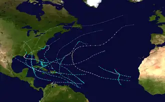 With a total of 13 tropical storms, this was the most active season without a major hurricane until 2013, which had 14 named storms and no systems reaching at least Category 3.[1] The seventh storm was considered a major hurricane until reanalysis by Jose Fernandez-Partagas and Henry Diaz in 1997, who revised the intensity to a Category 2 hurricane because observations did not support Category 3. In 2008, an additional hurricane was added to HURDAT, which existed in late August over the far eastern Atlantic Ocean. A tropical depression in early October may have become a tropical storm, but data was inconclusive.[2] Nearly all of the season's 14 tropical cyclones impacted land. Collectively, the storms caused over $1 million in damage and at least 35-40 fatalities.[5]