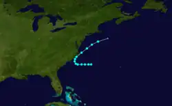 A ship detected a tropical storm about 230 mi (370 km) southeast of Cape Hatteras, North Carolina, at 12:00 UTC on August 30.[1][5] The storm moved westward, until turning northeastward late on August 31. At 00:00 UTC on September 1, the system peaked with maximum sustained winds of 50 mph (80 km/h). Eight hours later, it made landfall near Cape Lookout, North Carolina, at the same intensity. Shortly thereafter, the storm reemerged into the Atlantic Ocean. The system transitioned into an extratropical cyclone at 18:00 UTC on September 2, while located about 135 mi (215 km) southeast of Nantucket, Massachusetts.[1] The storm brought strong winds to portions of North Carolina and Virginia.[5]