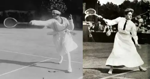 Lenglen (near court) and Lambert Chambers (far court) contesting the 1919 Wimbledon final