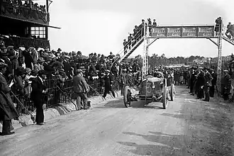 Foresti crashed in practice and Ferrari did not take the start because of mental exhaustion.[10] At the beginning of 35 laps, it was Segrave who had drawn pole position who took the lead. He held it until he had to pit with a misfire on lap 3 to change plugs. Bordino had come through the field getting his Fiat into the lead, pursued by Ascari, while Guinness and Campari tussled for third. On lap 9, Ascari moved into the lead when Bordino had to pit with fading brakes, as did his teammate Nazzaro.[10][30] The Sunbeam challenge was blunted when Guinness retired with crankshaft problems. Segrave brought his misfiring car back up through the field but only managed to reach sixth (while also setting the fastest lap time). Ascari was charging to victory when he suddenly slowed with just three laps to go. He was overtaken by Campari and Divo and he was forced to pit. When he could not restart the engine, his race was done. Campari held on to win the race with Divo just a minute behind in his Delage. His teammate Benoist was a further ten minutes back in third and Wagner was fourth in his Alfa.[31]
