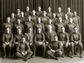 Center Chuck Bernard and end Ted Petoskey were also selected as first-team All-Americans by some selectors.[3][4][5][6] The team captain, Ivy Williamson, was selected as a second-team All-American in the Central Press Association's captains poll.[7] Gerald Ford, who later became the 38th President of the United States, was the back-up center on the team and won the Meyer Morton Award as the most improved player in spring practice.