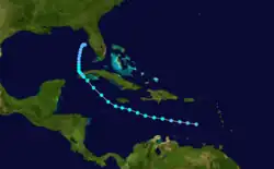 The seventh tropical storm of the season was first observed in the eastern Caribbean on August 14. It strengthened to reach winds of 45 mph (72 km/h). After passing just south of Jamaica, the storm turned to the northwest and crossed over both the Isle of Youth and western Cuba on August 18. It curved northward and dissipated west of Florida on August 21.[11]