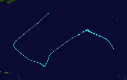 On September 7, a ship reported southwest winds at a location about 405 mi (650 km) northeast of Antigua, indicating the presence of a tropical cyclone. The storm tracked to the west-northwest without strengthening, and the following day no circulation was reported. It is estimated the storm weakened to a tropical depression and dissipated on September 8 while located about 235 mi (380 km) north-northeast of Saint Martin, although it may have remained a tropical depression throughout its short lifespan.[9] The storm never affected land.[1]