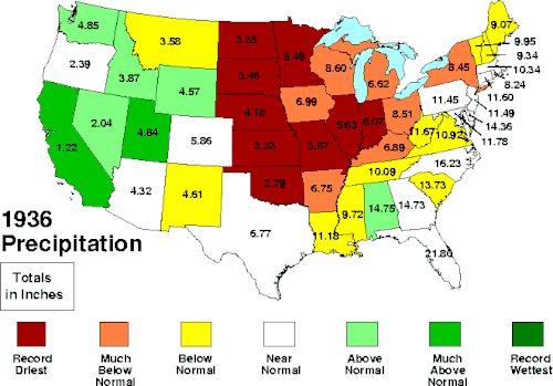 Summer (June–August) 1936 precipitation, in inches. Record wettest and driest is based on a 112-year period of records (from 1895 until 2006).