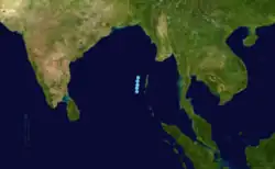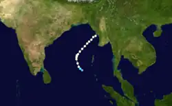On April 21, due to a temporary advancement of the southwest monsoon, a low-pressure area was first identified near the Nicobar Islands. Developing over the southeastern Bay of Bengal, later that day, it coalesced into an area of unsettled weather.[16] Further development occurred, and on 00:00 UTC the next day, the disturbance developed into a depression west of the Nicobar Islands.[16][17] Undergoing rapid intensification,[18] by 12:00 UTC that same day, the cyclone had peaked as a very severe cyclonic storm with sustained winds of 65 kn (75 mph; 120 km/h).[17] It later attained a minimum pressure of 993 hPa (29.3 inHg) at 21:00 UTC that day.[19] Soon after, the cyclone recurved,[17] with its intensity remaining the same as it tracked northeastward the next few days.[19] At 03:00 UTC on April 26,[17] the cyclone made its first landfall over Cheduba Island near peak intensity, producing intense winds there.[19] Soon after, it made its second landfall along the coast of Myanmar, somewhere between Thandwe and Kyaukphyu.[18] Rapidly weakening, it dissipated later that day.[19]