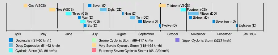 The 1936 North Indian Ocean cyclone season took place during the neutral phase of the El Niño–Southern Oscillation,[1] which is correlated with less activity in the basin.[2] Additionally, ENSO-neutral conditions are also correlated to a higher chance of landfall in the eastern coast of India,[3] hence the fact that a majority of the systems impacted land.[4] In total, the season had eighteen depressions, eight of which intensified into deep depressions, with six intensifying further into cyclonic storms, and three further developing into severe cyclonic storms and very severe cyclonic storms.[4]