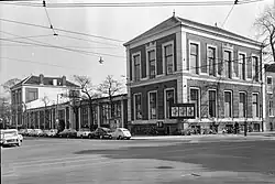 In 1943, a group of resistance members, led by sculptor Gerrit van der Veen and painter and author Willem Arondeus, meticulously planned to carry out a sabotage attack on the Amsterdam civil registry office, with the aim to destroy the records, without causing any loss of life.[1] The mission was particularly difficult because security at civil registries had been tightened up after a similar assault on an office in Wageningen in late 1942. Security guards were now posted at strategic locations in the Amsterdam civil registry office.[2] The group preparing the attack included a number of local artists and medical students, including several Jews and homosexuals, as well as a group of resistance members behind the clandestine publication Rattenkruid.