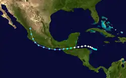 Early on October 2, the tenth tropical storm of the season was noted about 150 mi (240 km) northeast of the Nicaragua–Honduras border. It intensified into a Category 1 hurricane by 00:00 UTC the next day on a general west-northwest track and peaked with winds of 90 mph (140 km/h) 24 hours later,[2] although the crew aboard a reconnaissance aircraft originally estimated 100 mph (160 km/h) sustained winds.[3] The cyclone tracked west-southwest and made landfall north of Punta Gorda, Belize at peak strength, quickly weakening once inland. Crossing Guatemala and Chiapas, the depression paralleled the coastline of Mexico for a time before moving ashore west of Lázaro Cárdenas, Michoacán. The wilting system dissipated over southern Durango by 12:00 UTC on October 7.[2]