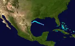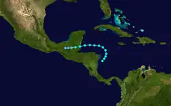A tropical storm formed southeast of the Nicaragua–Honduras border early on August 29 and tracked northeast. After curving north and then west, the cyclone attained peak winds of 70 mph (110 km/h) over the Gulf of Honduras early on August 31. It moved ashore near Belize City, Belize at peak strength, where heavy rainfall and high tides resulted in flooding of 2–3 ft (0.61–0.91 m) within the city.[3] The system weakened quickly once inland, dissipating just northeast of Ocosingo, Chiapas by 18:00 UTC on September 1.[2]