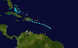 Around 00:00 UTC on August 2, the third tropical cyclone of the season formed about 85 mi (137 km) northeast of Barbados. It crossed Dominica into the Caribbean Sea, where the storm attained peak winds of 60 mph (97 km/h) and prompted small craft advisories.[2][12] Missing Puerto Rico to the south, the cyclone then moved ashore west of Santo Domingo in the Dominican Republic at peak strength early on August 4.[3] It dissipated over the island later that day and produced only scattered thundershowers across the region,[2][13] including up to 9.7 in (246 mm) of rainfall on Montserrat in a 24-hour period.[14]