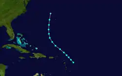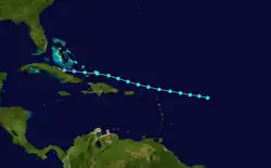Another short-lived tropical storm was first identified about 195 mi (314 km) east of Guadeloupe by 12:00 UTC on September 9. Data from a reconnaissance aircraft indicated the storm intensified slightly to attain winds of 60 mph (97 km/h) by early the next day,[2] in spite of a poorly defined circulation center.[3] It tracked northwest and then north, passing within 130 mi (210 km) of Bermuda before dissipating around 18:00 UTC on September 12.[2]