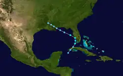 On the heels of Tropical Storm Six, a new tropical depression formed over the western Caribbean Sea by 18:00 UTC on September 3. The fledgling cyclone moved northeast and crossed the western coastline of Cuba near Punta de Cartas before emerging into the Straits of Florida early on September 4. The depression intensified into a tropical storm and attained peak winds of 40 mph (64 km/h), maintaining such strength as it moved ashore near Sanibel, Florida by 00:00 UTC on September 5. It turned abruptly northwest into the northern Gulf of Mexico and weakened to a tropical depression before making a second landfall along the coastline of Mississippi. The weak depression dissipated about 45 mi (72 km) south-southeast of Monroe, Louisiana around 18:00 UTC on September 6.[2] A testament to the weak nature of the storm, only scattered squally weather affected southern Florida, amounting to minor damage to boats in Miami harbors.[3]