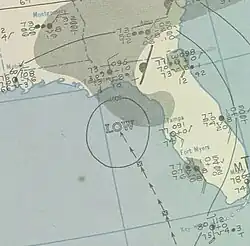 Damage from the hurricane throughout Florida was relatively minor. Citrus trees were stripped of their branches, roadways were washed out, and some telephone and power lines were toppled, temporarily severing communication.[5] Tampa recorded a record 24-hour rainfall total of 10.42 in (265 mm),[3] while precipitation peaked at 13.6 in (350 mm) in Lake Alfred.[6] Statewide, the heavy precipitation was regarded as beneficial in ending one of the worst recorded droughts there.[3] Two tornadoes were spawned; one blew a transformer off a platform and ripped a section of railing off a causeway, while both damaged some homes. Total damage reached $75,000 throughout Miami.[7] Farther north, telephone communications around Georgetown, South Carolina were disrupted, while winds gusted as high as 69 mph (111 km/h) and rainfall peaked at 5.58 in (142 mm) in Charleston.[8] In Wilmington, North Carolina, 8.24 in (209 mm) of rain was observed, causing considerable damage to the city's storm sewer system.[9] Although the core of the cyclone passed east of New England, at least 10,000 telephone lines were downed by the storm. Buildings, crops, and trees were damaged, while low visibility led to a traffic accident that killed a man in Warwick, Rhode Island.[10]