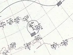 The final Atlantic hurricane of 1945 was not officially documented until over a decade following the end of the season. Using re-analyzed surface weather maps, as well as recounts from local residents along the storm's path, it was discovered that a tropical depression formed south of Jamaica in the southwestern Caribbean Sea by 12:00 UTC on October 10.[2][22] The compact storm moved north and then north-northeast ahead of a stationary front that existed from the western Atlantic into the Bay of Campeche. It became a minimal hurricane over the Cayman Islands by 00:00 UTC on October 12 and attained its peak at Category 2 intensity with winds of 100 mph (160 km/h) while making landfall along a deserted southern stretch of Cuba. The storm emerged into the Bahamas while maintaining Category 1 strength before becoming intertwined with the frontal zone and transitioning into an extratropical cyclone southwest of Bermuda.[22] The post-tropical storm slowly weakened but persisted until it was absorbed by a large extratropical low near the Azores on October 16.[2]
