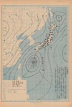 In Japan, Typhoon Ida is called Makurazaki Typhoon. It was the strongest typhoon to hit Kyushu on record, with a minimum sea-level pressure of 916.1 hPa (27.05 inHg) observed on the land and a maximum wind gust of 62.7 metres per second (140 mph), which was recorded at a weather station in Makurazaki.[9] More than 2,000 people were killed in the Hiroshima Prefecture after heavy rains brought by a weakening Ida caused severe landslides.[10]