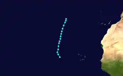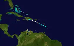 A tropical depression formed to the east of the Lesser Antilles on August 30. It moved steadily west-northwestward,[8] passing over Barbados as a weak tropical storm.[6] Seven people drowned on the island and 27 houses were destroyed in Bridgetown.[9] On Dominica, winds uprooted some trees, while rough seas damaged roads, jetties, and Landings.[15] After entering the Caribbean Sea on September 1, hostile conditions weakened the storm, and the third tropical cyclone of the season degenerated into a tropical wave on September 3 to the south of the eastern tip of the Dominican Republic.[8]