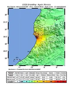 The 1960 Agadir earthquake occurred on 29 February at 23:40:18 Western European Time near the city of Agadir, located in western Morocco on the shore of the Atlantic Ocean. Despite the earthquake's moderate Mw scale magnitude of 5.8, its relatively shallow depth (15.0 km[7]) resulted in strong surface shaking, with a maximum perceived intensity of X (Extreme) on the Mercalli intensity scale. Between 12,000 and 15,000 people (about a third of the city's population of the time) were killed and another 12,000 injured with at least 35,000 people left homeless, making it the most destructive and deadliest earthquake in Moroccan history. Particularly hard hit were Founty, the Kasbah, Yachech/Ihchach and the Talborjt area. The earthquake's shallow focus, close proximity to the port city of Agadir, and unsatisfactory construction methods were all reasons declared by earthquake engineers and seismologists as to why it was so destructive.
