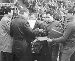 ![]() Players of Vorwärts Berlin receive the championship trophy before the final game of the season | |