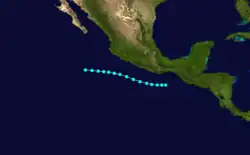 Fernanda formed on September 3 southwest of Guatemala where it moved west-northwest as a category 1 hurricane before dissipating on September 8 southwest of Mexico.[2]