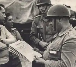The 5th RI managed to travel in army trucks and three private buses, and the 6th, in private trucks and the Pássaro Marrom company's buses.[14] The 1st Light Tank Battalion (BCCL) from Campinas continued to board trains, although, according to Colonel Cid de Camargo Osório, from the General Staff of the 2nd Army, its movement was delayed by the "internal enemy", which managed to cut off electricity supply. The transport situation was difficult, and they had to provide resources to personnel who were still on foot.[15] Fuel along the way was guaranteed by governor Adhemar de Barros. Under his order, Postos Atlantic's petrol stations filled vehicle tanks "without bureaucracy; a 'note' was signed and that was it".[16]