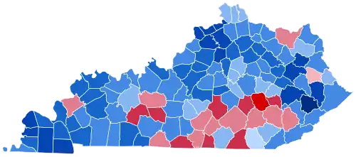 This is the solitary occasion since the Civil War where the Unionist strongholds of Whitley County and Knox County[5] have voted for a Democratic presidential candidate.[6] As of the 2024 presidential election, this is the last election in which the following counties voted for a Democratic presidential candidate: Kenton, Boone, Campbell, Oldham, Jessamine, Wayne, Whitley, Estill, Garrard, Green, and Lee.[7] This is also the last time that a Republican presidential nominee has failed to win more than 40% of the vote in Kentucky, that the Democrat has won more than 60%, and that the Democratic nominee has won the state by double digits.