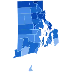 Johnson swept all five counties in Rhode Island with over 70% of the vote. In Providence County, the most populated county, home to the state's capital and largest city, Providence, Johnson took 83.5% of the vote.[1] Washington County voted Democratic for the first time since 1852. This was the strongest showing ever for a Democratic presidential candidate in Providence County and the strongest performance of any candidate of any party in any county in Rhode Island. Johnson's 80.87% remains the highest vote share percentage any presidential candidate of either party has ever received in Rhode Island,[2] and his 61.74% victory margin remains the widest margin by which any candidate of either party has ever won the state. Additionally, Johnson's victory, alongside Goldwater's victory in Mississppi marked the last time a Presidential nominee won over 80% of the vote in a state.