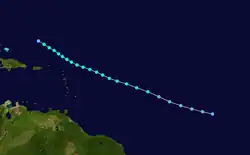 On September 26 and September 27, satellite imagery and ships monitored an area of disturbed weather located to the east of the Lesser Antilles and following Hurricane Inez. Based on reports of a circulation,[5] the system developed into a tropical depression at 00:00 UTC on September 27. The depression intensified slowly and became Tropical Storm Judith around midday on September 28. While centered north of Barbados the next day, Judith attained its peak intensity with maximum sustained winds of 50 mph (80 km/h) and a minimum barometric pressure of 1,007 mbar (29.7 inHg),[6] both of which were observed by a reconnaissance aircraft flight.[5] Shortly thereafter, the storm crossed through the Windward Islands and weakened to a tropical depression, possibly due to entering the outflow of Inez. At 12:00 UTC on September 30, Judith dissipated over the eastern Caribbean Sea.[6] Winds up to 37 mph (60 km/h) were observed on Martinique.[5]