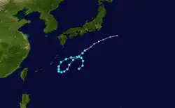Therese emerged in the western Pacific on March 15 near the Caroline Islands as a tropical depression. Within 24 hours, it intensified into a tropical storm, moving steadily west-northwestward through the Philippine Sea. By March 18, Therese reached its peak intensity with sustained winds of 110 km/h (70 mph) and a central pressure of 990 hPa, classifying it as a "severe tropical storm" per the Japan Meteorological Agency (JMA).[2]