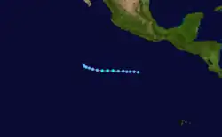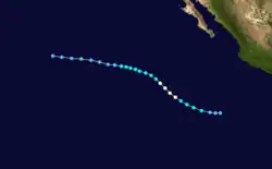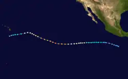 Tropical Storm Hilary developed about 115 mi (185 km) west of Clipperton Island on July 26. Hilary strengthened quickly into a hurricane by July 28 and a recon plane found surface winds of 90 mph (140 km/h) and noted a well-defined eye. The hurricane would peak as a category 2 with sustained winds of 100 mph (160 km/h) on July 30.[3] Hilary weakened slightly as its motion became erratic across the tropical Pacific Ocean. By August 1 the hurricane turned to the northwest towards cooler waters. Hilary weakened into a tropical storm on August 3 after being at hurricane strength for a week.[3] Steady weakening continued over the next four days before dissipating in the Central Pacific.