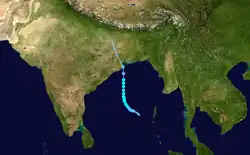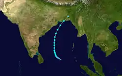 This system formed as a tropical depression in the southern Bay on December 5, strengthening into a tropical storm as it turned north-northwest on December 5, then to near-hurricane strength on December 6. The cyclone recurved, striking Indian near Calcutta on December 9, though its main impacts were across Bangladesh.[4]