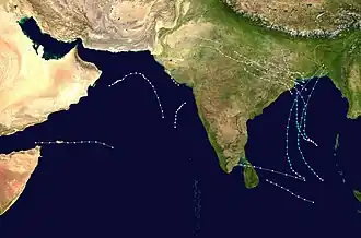 The 1973 North Indian Ocean cyclone season was part of the annual cycle of tropical cyclone formation. The season has no official bounds but cyclones tend to form between April and December. These dates conventionally delimit the period of each year when most tropical cyclones form in the northern Indian Ocean. There are two main seas in the North Indian Ocean—the Bay of Bengal to the east of the Indian subcontinent and the Arabian Sea to the west of India. The official Regional Specialized Meteorological Centre in this basin is the India Meteorological Department (IMD), while the Joint Typhoon Warning Center (JTWC) releases unofficial advisories. An average of five tropical cyclones form in the North Indian Ocean every season with peaks in May and November.[1] Cyclones occurring between the meridians 45°E and 100°E are included in the season by the IMD.[2]