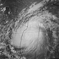 Doris made meteorological history when, on August 31, it became the first Atlantic hurricane ever to be upgraded to hurricane intensity solely on the basis of satellite pictures,[1] via the Dvorak technique.[7] The cyclone then curved northward and intensified further during the next few days, becoming a Category 2 hurricane early on September 2.[3] Based on the Dvorak technique, it is estimated that Doris peaked with maximum sustained winds of 110 mph (180 km/h) and a minimum barometric pressure of 965 mbar (28.5 inHg) shortly thereafter. By September 3, the hurricane began interacting with a non-tropical low pressure area.[7] On the following day, Doris quickly weakened to a tropical storm and transitioned into an extratropical cyclone about 830 mi (1,340 km) south-southeast of Cape Race, Newfoundland, around 06:00 UTC. The extratropical remnants weakened and then dissipated late on September 4.[3]