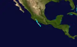 An area of disturbed weather and associated tropical wave was observed east of Acapulco on July 3.[4] It moved southwest during the early stages of its existence before curving more toward the northwest. Satellite imagery identified the existence of a tropical depression by 18:00 UTC on July 6,[5] and that depression quickly intensified into Tropical Storm Emilia six hours later. The newly named storm gathered strength over subsequent days, attaining peak winds of 65 mph (105 km/h) around 06:00 UTC on July 9.[6] Beyond that time, Emilia crossed into cooler waters and began to rapidly weaken,[5] dissipating after 18:00 UTC on July 10.[6]