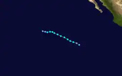 A small disturbance coincident with a tropical wave was first identified south of Acapulco on August 19.[4][5] The system moved west and coalesced into a tropical depression around 18:00 UTC on August 23.[6] The depression failed to intensify over subsequent days, and in fact, it was operationally downgraded back to a disturbance on August 26.[5] In the official database, the cyclone maintained its status and eventually intensified into Tropical Storm Miriam around 00:00 UTC on August 27.[6] Miriam turned west-southwest and entered the Central Pacific,[5] where it intensified into a hurricane at 12:00 UTC on August 28 and reached peak winds of 90 mph (140 km/h) twelve hours later.[6] Miriam then began to steadily weaken as it passed south of Hawaii,[5] and the cyclone dissipated after 00:00 UTC on September 2.[6]
