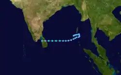 The last storm of the season formed in the central Bay of Bengal on December 12. It moved east-southeastward, then turned to the west where it briefly became a tropical storm. The storm struck eastern Sri Lanka and dissipated over the island on the 17th.