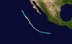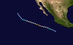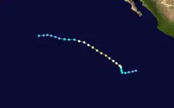 A tropical disturbance south of Acapulco developed into a tropical depression on September 16 and a tropical storm later that day. Kay headed in an irregular but generally west-northwest path out to sea. Kay strengthened into a hurricane on September 17. It continued strengthening and reached its peak as a Category 4 hurricane on the Saffir–Simpson scale on September 18. Kay then slowly weakened and was a tropical storm by September 20. Kay's forward motion slowed as it neared the central Pacific. It restrengthened into a hurricane on September 23, crossed 140°W, and entered the Central Pacific Hurricane Center's area of responsibility the next day.[2] Kay executed a small anticyclonic loop, and then began weakening again. It became a tropical storm again on September 27, and a depression two days later. The cyclone dissipated on September 30 while located north of the Hawaiian Islands.[4] Kay did not effect land, causing no damage or casualties.[2] It was the strongest tropical cyclone of the season at 140 mph (225 km/h). Kay lasted for 14.5 days, enough to make it the fifth-longest-lasting Pacific hurricane at the time.[4]